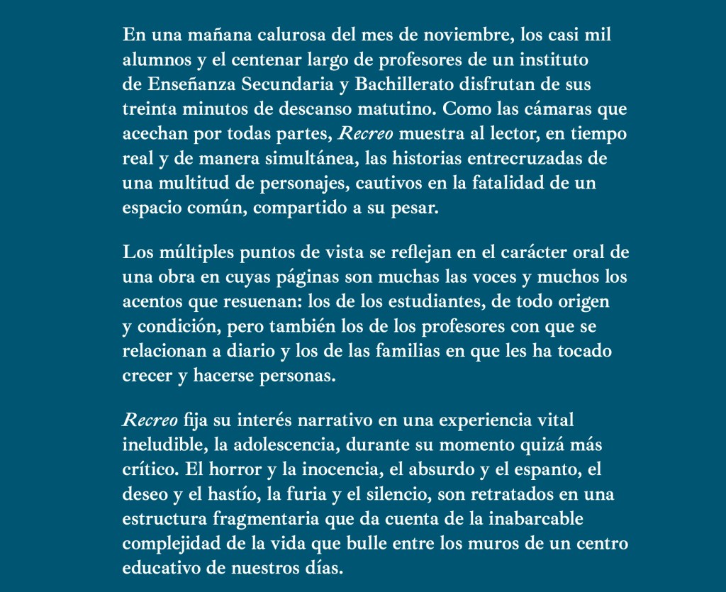 En estos dos años transcurridos desde entonces me he dedicado a pulir el texto, revisándolo una y otra vez, y a intentar que alguien me lo publicara, cosa que, finalmente, no ha ocurrido. Ninguna editorial ha querido publicar Recreo en este tiempo, y no voy a entrar en las razones que se me ocurren porque es muy temprano para encabronarse y, además, ya no tiene remedio. En pocas palabras, en diciembre pasado admití mi derrota y opté por el que yo siempre he considerado el último cartucho: la autopublicación.